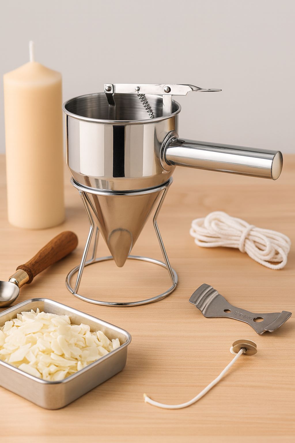 Tämä suppilo on välttämätön työkalu jokaiselle kynttiläharrastajalle ja ammattilaiselle, joka arvostaa siistiä, hallittua ja tehokasta työskentelyä.